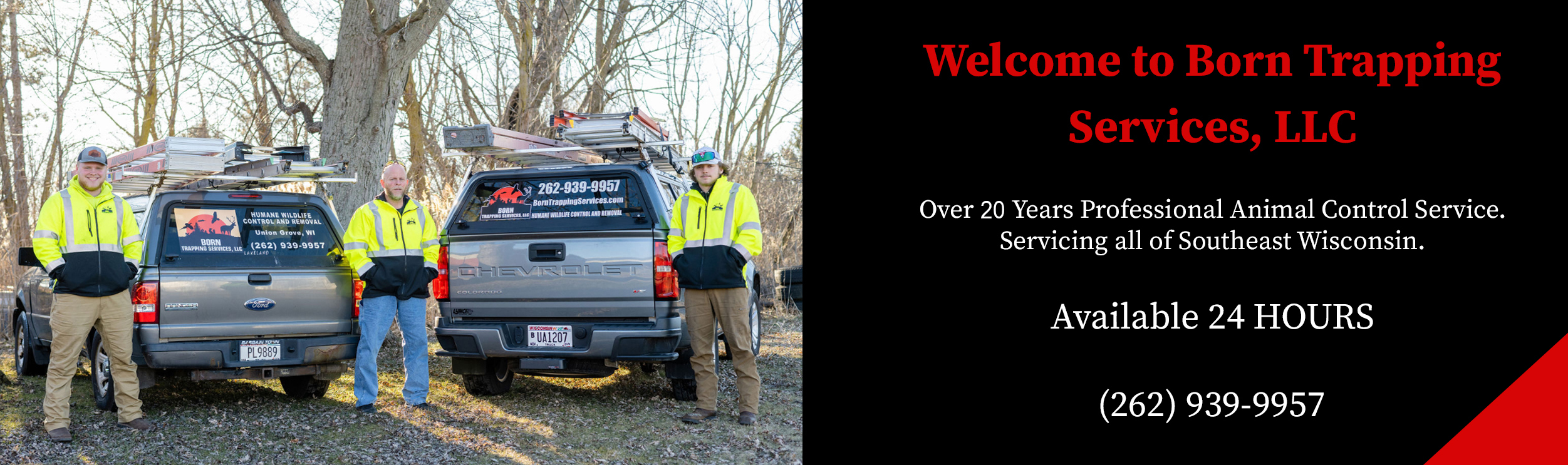 I offer animal control 24-hours a day, so call me anytime at 262-939-9957 or email me at john@borntrappingservices.com